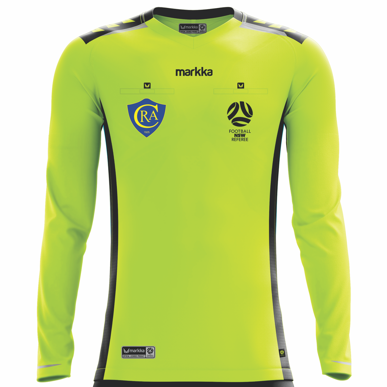 Introducing the Markka Bosko Referee Jersey, the perfect choice for any football match official. This short sleeve jersey features velcro pockets with rubber pull tags, a mesh back panel and mesh side panels for ultimate breathability. Officially licensed by Football Australia, with reflective accents and a Markka logo shoulder panel for added visibility and style.