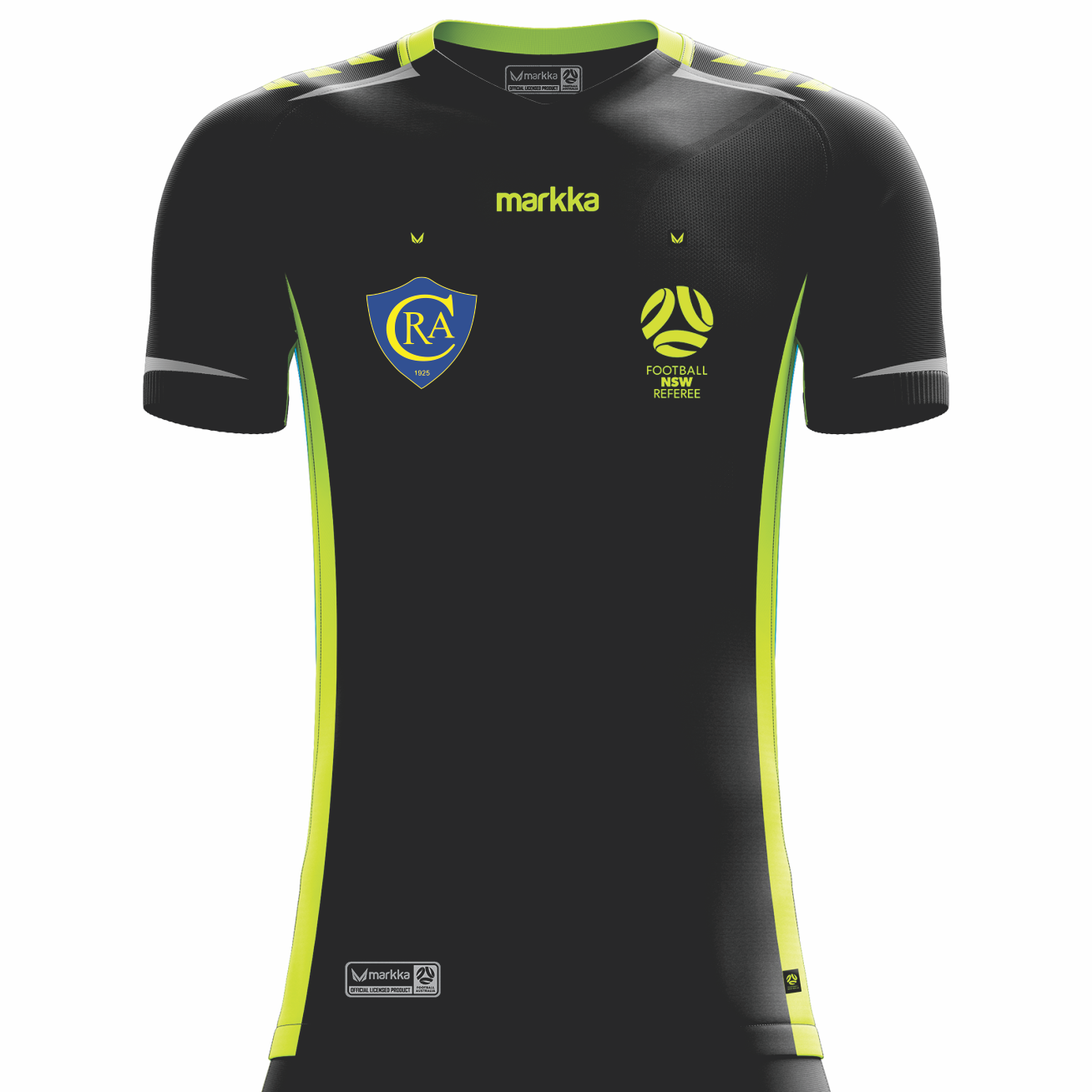 Introducing the Markka Bosko Referee Jersey, the perfect choice for any football match official. This short sleeve jersey features velcro pockets with rubber pull tags, a mesh back panel and mesh side panels for ultimate breathability. Officially licensed by Football Australia, with reflective accents and a Markka logo shoulder panel for added visibility and style.