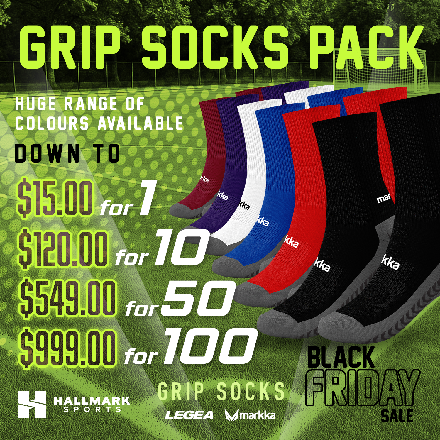 A bulk bundle of our high-performance Markka grip socks designed for stability, comfort, and traction on the pitch. Available in a wide range of colours with multiple pack sizes to suit individuals, coaches, and clubs.